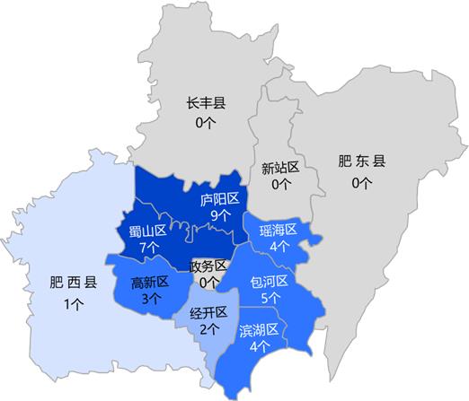 本月统计的35个集中式长租公寓项目主要分布庐阳、蜀山和包河。其中庐阳区居多,有9个项目;其次为蜀山和包河,分别有7个和5个;滨湖、瑶海和高新分别有4个、4个和3个项目。