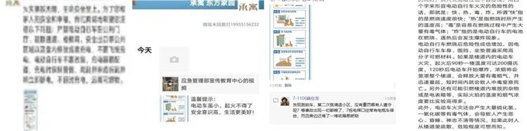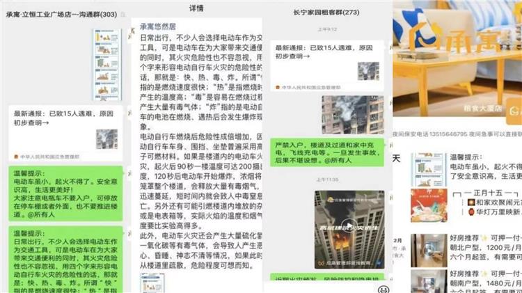 其次,开展电动自行车安全宣传工作,各租赁项目充分利用宣传栏、租户微信群等载体,通过微信朋友圈发布、宣传栏张贴通知等途径,将电动自行车违规停放、充电的危害广而告之,实现对于租户宣传教育引导,增强电动自行车安全意识。