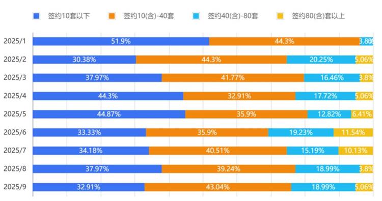 从签约套数分布来看,32.9%的项目签约套数在10套以下,占比环比下跌5.1个百分点;签约套数在10-40套的占比43%,环比上涨3.8个百分点;签约套数在40-80套的占比19%,占比与上月一致;项目签约套数80套以上的占比5.1%,环比上涨1.3个百分点。