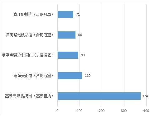 从具体项目来看,9月,高新云果·雁湾居、冠寓·瑶海天街店、承寓·智慧产业园店签约量位列前三,分别签约374套、110套、93套。本月签约套数最多的5家门店中合肥冠寓占3家,高新租赁、安居集团各占1家。