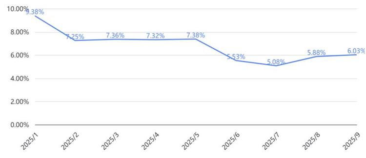图:2025年1月-2025年9月集中式长租公寓空置率变化(单位:%)