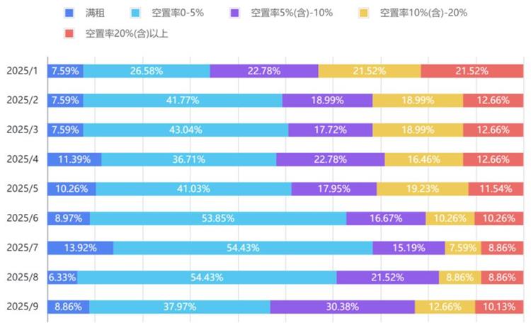 图:2025年1月-2025年9月不同空置率项目占比变化(单位:%)