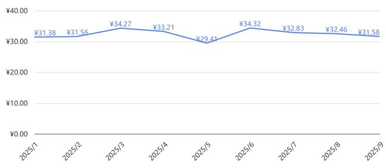 图:2025年1月-2025年9月集中式长租公寓单平米租金变化(单位:元/平方米/月)