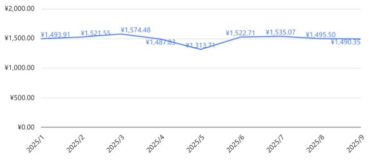 图:2025年1月-2025年9月集中式长租公寓套均合同租金变化(单位:元/月)