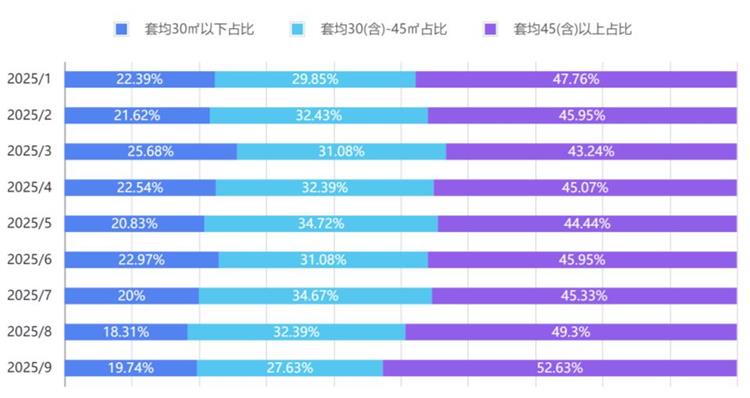 图:2025年1月-2025年9月不同套均面积项目占比(单位:%)