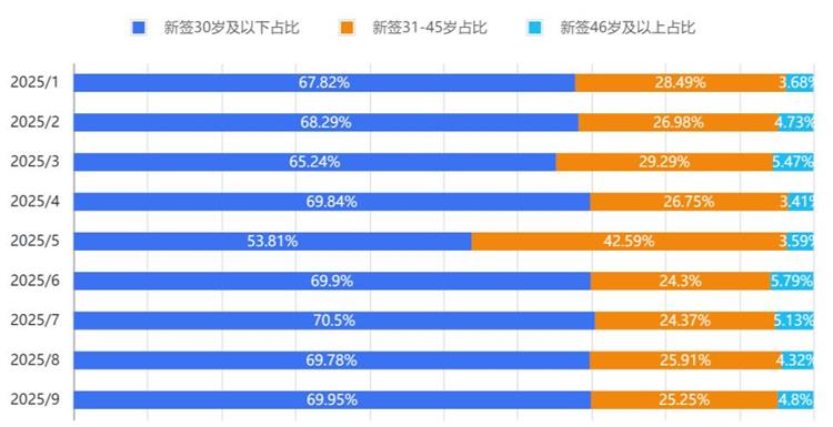 从年龄段来看,9月30岁以下租客占69.9%,环比上涨0.2个百分点,占比远超其它年龄段;31-45岁租客占25.3%,环比下跌0.7个百分点;46岁及以上租客仅4.8%,环比上涨0.5个百分点。