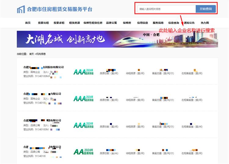 (一)合肥市住房租赁交易服务平台(https://www.hfzfzlw.com/)——信息查询——机构信息——搜索企业名称——可查询企业类型、法人代表、营业执照、上年度信用评级等级、房源数量——可打印出来进行公示。