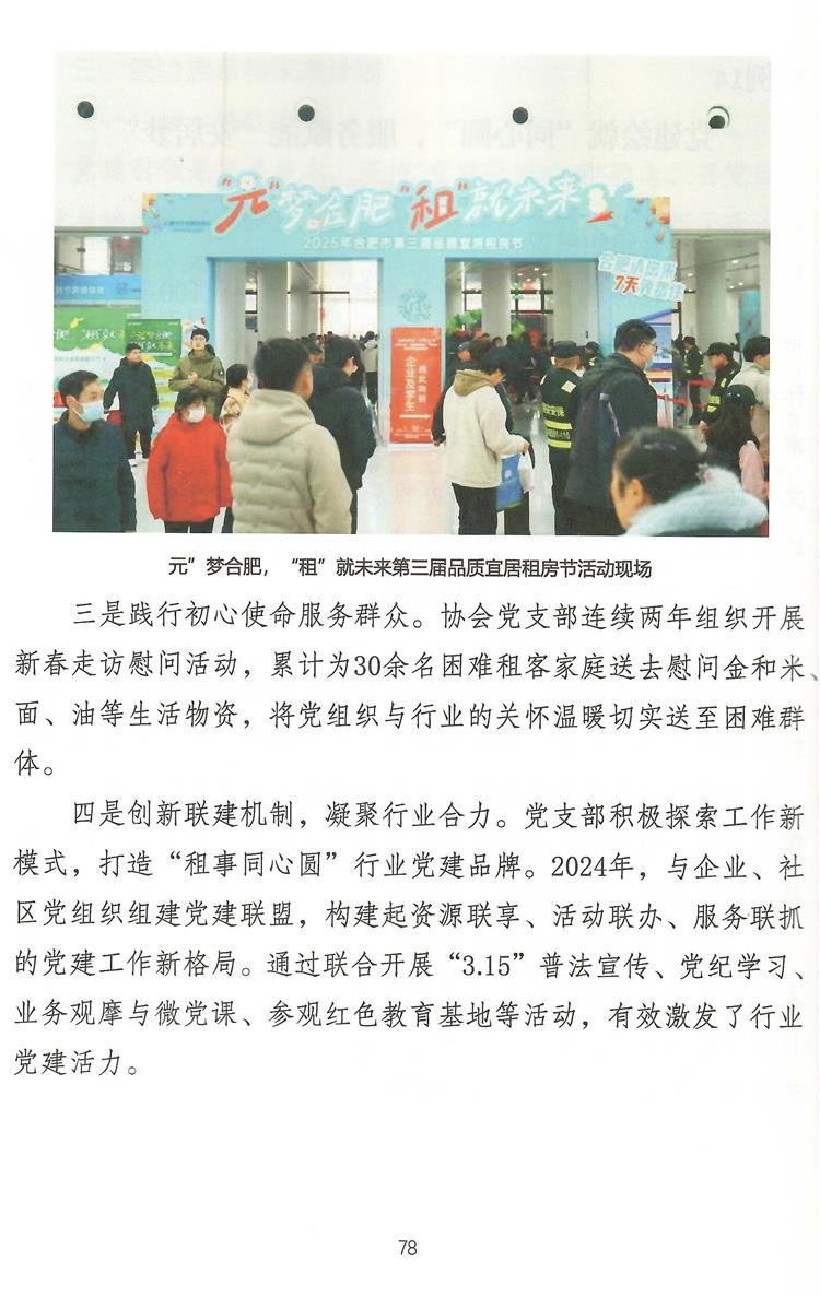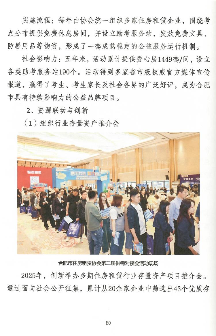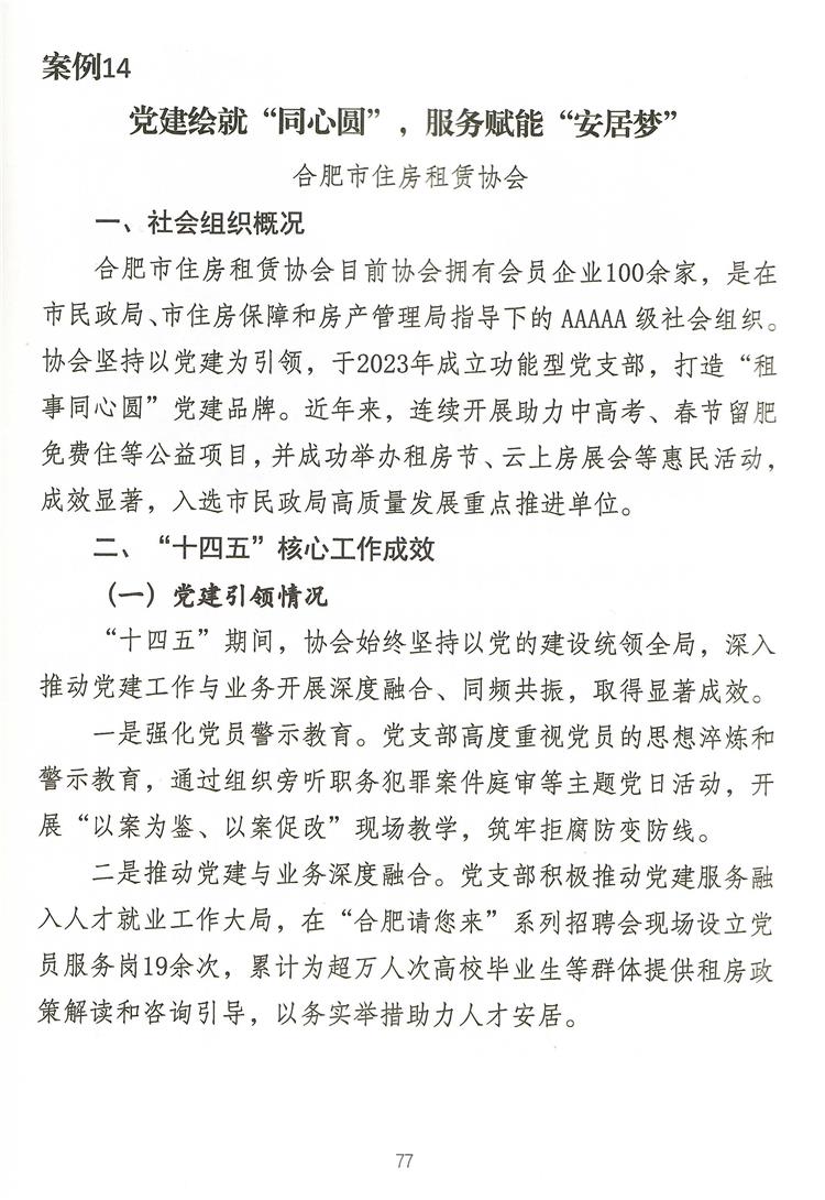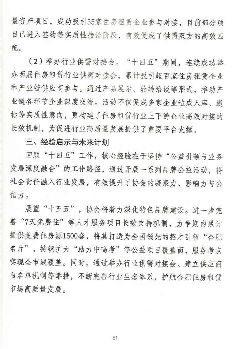 协会此次入选的推文“党建绘就‘同心圆’,服务赋能‘安居梦’”,系统总结了我协会“十四五”期间的核心成果、经验启示与未来展望。文章集中展现了我协会通过打造“租事同心圆”党建品牌,将党的领导贯穿于行业自律、服务民生全过程;通过持续运营“品质宜居租房节”、“助力中高考”、“春节留肥免费住”等一系列品牌公益活动,在服务城市人才战略、履行社会责任中擦亮行业名片;以及通过举办行业供需对接会、项目推介会等,有效链接资源,赋能行业主体,构建健康生态。 文章清晰阐明住房租赁行业的高质量发展,必须坚持以人民为中心,将公益之心与市场之力有机结合,引导企业向专业化、规模化、品质化转型。只有不断优化租住体验、保障租客权益,才能切实增强新市民、青年人的归属感与幸福感,为城市的繁荣与发展奠定坚实安居基础。 此次入选市民政局“十四五”高质量发展案例集,是荣誉,更是动力。站在“十五五”的开局之年,合肥市住房租赁协会将以此为新的起点,持续深化党建与业务融合,进一步做优做强公益品牌,拓展行业服务的广度与深度,为规范市场发展、推动行业转型升级、助力合肥打造人才集聚高地与宜居幸福之城贡献更大力量!