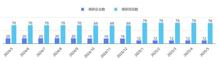 图:2024年5月-2025年5月调研企业和项目数(单位:家、个)