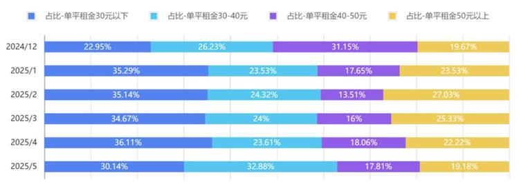 图:2024年12月-2025年5月不同区间段租金项目占比(单位:%)
